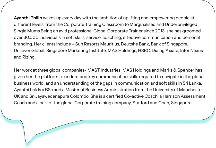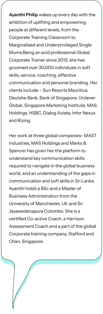 Before I joined the Business English Program I was very shy to speak in English with others. I would like to thank Ms Ayanthi- you built up my self-confidence.
